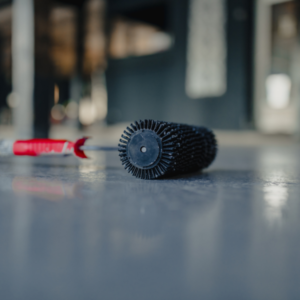 The concrete is mechanically prepared through grinding and repairs to ensure proper adhesion and long-lasting results.